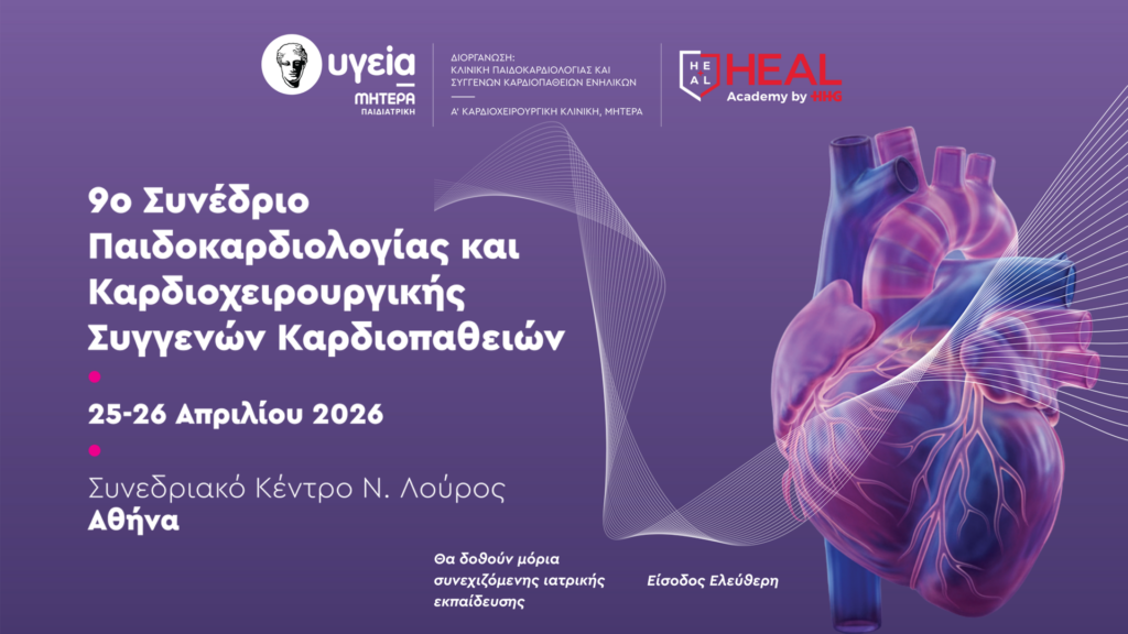 Εκδηλώσεις - Συνέδρια4 Μαρτίου 2026 9ο Συνέδριο Παιδοκαρδιολογίας και Καρδιοχειρουργικής Συγγενών Καρδιοπαθειών, 25-26 Απριλίου 2026, Συνεδριακό Κέντρο Ν. Λούροςhttps://medevents.gr/congress/9chd Share Previous Post Webinar «Νομικά και Ηθικά ζητήματα στην Παιδική και Εφηβική Γυναικολογία» 27/02/26